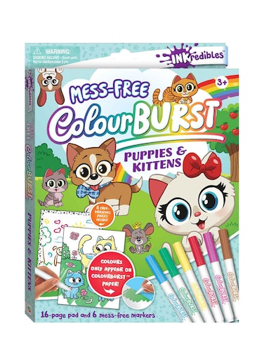 Animal lovers will adore colouring their way through this cute and cuddly Inkredibles Colour Burst: Puppies and Kittens activity book. Featuring oodles of pooches and kitties, the markers in this kit help the charming images seemingly bounce from the page in living colour.