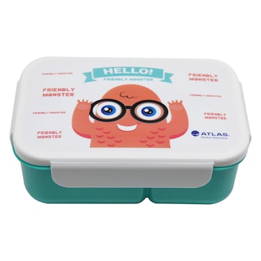 The Atlas Friendly Monster Printed Lunch Box with Spoon Green is a fun and practical lunch box for kids.