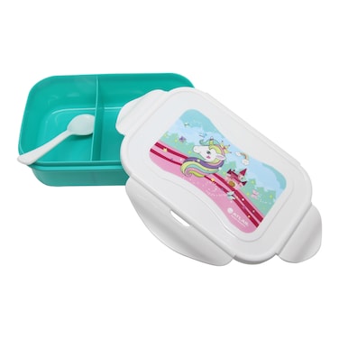 The Atlas Unicorn Printed Lunch Box with Spoon in Green is a stylish and practical lunch box for kids.