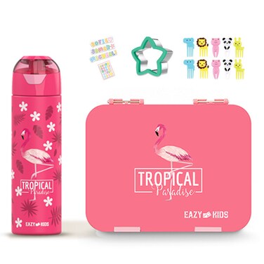 Eazy Kids 6 & 4 Convertible Bento Lunch Box with Stainless Steel 640ml Water Bottle and Sandwich Cutter Set - Tropical Pink