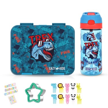 Eazy Kids 6 & 4 Convertible Bento Lunch Box with Tritan 420ml Water Bottle and Sandwich Cutter Set - TREX Blue