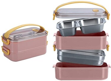 Product Dimensions:22 x 12.5 x 11.5 cm, Product Color: Pink / 2x800 ml food containers with ventilated lids top cover elastic strap, one food divider, 2 material variations: Stainless Steel and PP