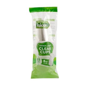 Falcon Pet Cups Clear 237ml 25 PCS is a pack of 25 clear pet cups with a capacity of 236.58ml each.