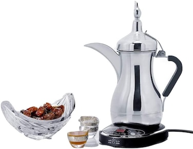 The Arabic JLS 170E Electric Coffee Maker lets you make traditional Arabian coffee without breaking a sweat. This coffee maker, which comes with a stainless steel kettle and a heater base with digital display, is very easy to use and clean. The kettle has that distinct Arabic styling. Its long spout ensures that you do not spill any coffee while pouring. The coffee maker allows you to brew that perfect Arabian style coffee at home in six easy steps. In a single serving, this Arabic coffee machine can brew more than 30 small cups in its kettle. The machine keeps coffee hot for about two hours straight. The dry protection feature of this coffee maker automatically turns the appliance off if there insufficient water in the kettle. The appliance comes with a measurement spoon, filter and carry bag. This coffee maker is very safe to use and can also be used as a water boiler.