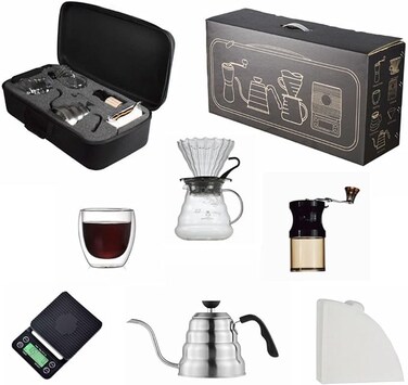 Include:1*Glass Dripper, 1*Glass Pot, 1*250ml Mug ,1*Manual Grinder ,1*Coffee Scale With Timer ,1*1. 0L Kettle ,1*100Pcs Filter,1*carry bag.