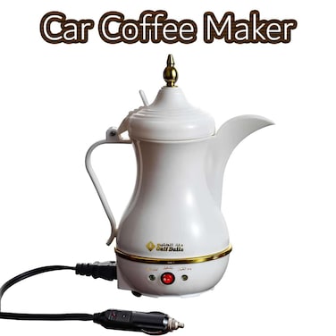 Car dallah for making coffee while traveling, Prepare your coffee at the touch of a button, Easy to clean, use and move, Auto-off feature after preparing coffee, Stainless steel body with coffee filter, Capacity: Dallah capacity is 400 ml, It works with a 12 volt 120 watt car lighter