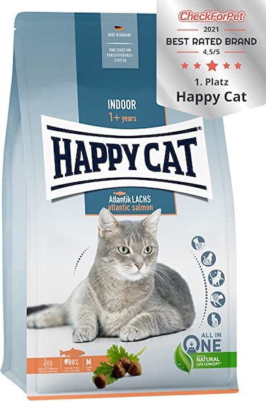 Happy Cat Indoor Atlantic Lachs The easily digestible formulation with Atlantic salmon and valuable herbs (coriander and milk thistle) has been specially developed to meet the needs of indoor cats. Natural fibre supports a reduction in hairballs, and yucca helps to minimise stool odour. The customised fat content supports optimal weight management.