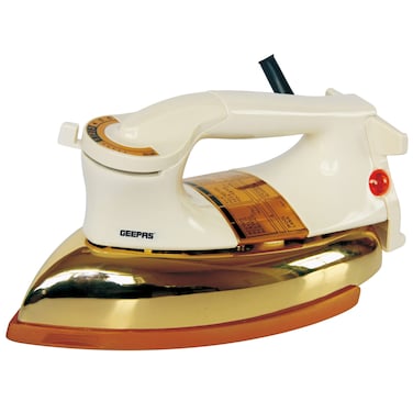 - Geepas dry iron with non stick golden teflon coated soleplate and overheat protection, The Geepas Dry Iron Gdi2750 lets you iron your linen quickly, efficiently, and safely. It has a practical design that also makes it compact so you can handle and store it conveniently. It requires very less time to heat up and when ready, provides super fast results.