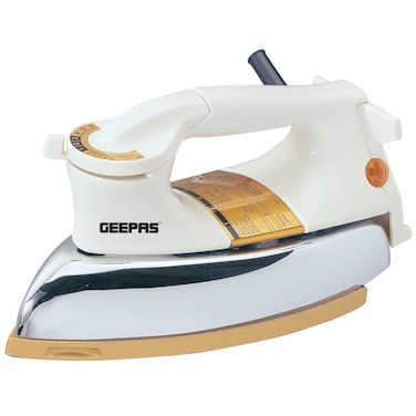 - Geepas dry iron with teflon coated soleplate and overheat protection, The Geepas Dry Iron Gdi2752 lets you iron your linen quickly, efficiently, and safely. It has a practical design that also makes it compact so you can handle and store it conveniently. It requires very less time to heat up and when ready, provides super fast results.
