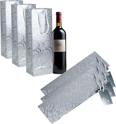 Cuisine Art Wine Bags, Wine Gift Paper Bags Single Bottle Wine Gift Bags Red Wine Tote Bags, 6Pcs 4.7 x 3.9 x 14.2’’ Wine Gift Bags Kraft Paper Wine Bags Bulk with Handles, Pack of 6 Silver