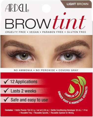 Ardell Brow Tint Light Brown Calling all light brown-browed babes! Get salon-quality results at home with Ardell's new and easy-to-use Brow Tint! Our permanent dye safely and effectively lets you achieve a pro-inspired tint service at home that lasts up to two weeks. Ardell Brow Tint is a water-activated, permanent dye that effectively covers all hair including short, grey and light hair. Simply mix the powder color with the water based activator, apply, wait and wipe off for perfectly defined arches. Brow tinting is one of the most low-maintenance ways to make brows appear fuller and more prominent without makeup or the time and expense of microblading.