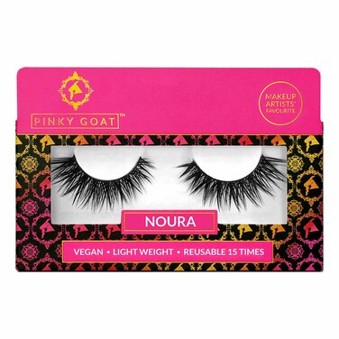 NOURA delivers extra flair and volume with a unique double-layered, cross-hair and a thin dark band to intensify your look. It's no wonder this style is a bestseller amongst makeup artists worldwide. Perfect for all eye shapes. This handmade vegan lash is reusable up to 15 times and is best used with Pinky Goat GLUEME Lash Adhesive and (sold separately).
