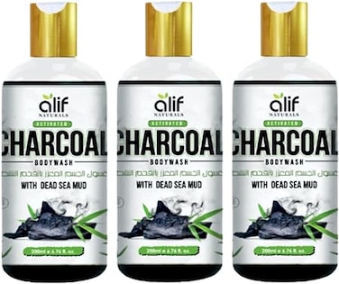 Alif Naturals Charcoal Body Wash , With Goodness Activated Charcoal and Dead Mud Sea Tan Removal, Glowing Skin, Germ Protection & Deep Cleansing Pack of 3