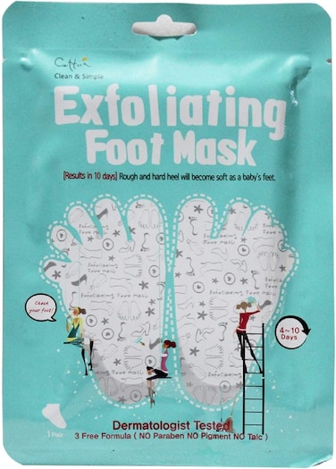 Foot exfoliant plus treatment filled in a pair of wearable mask sheets Put on the mask as you would your socks. It removes all calluses over time, visibly smoothing your feet