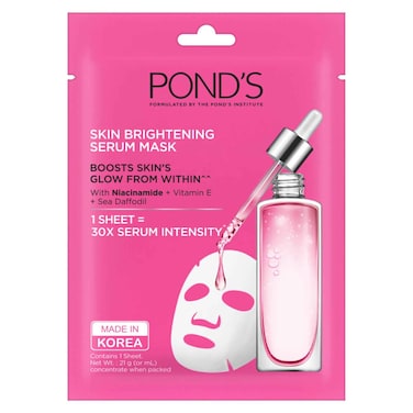 - Pond's Skin Brightening Serum Face Sheet Mask is made in Korea with skin-loving ingredients like Niacinamide, Vitamin E & Sea Daffodil for glowing skin.