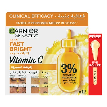 Garnier SkinActive Fast Bright Vitamin C+Niacinamide Serum Ampoules 1.5ml Pack of 12 With Eye Roller Yellow