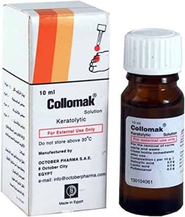 Collomak to be applied four time a day directly on cons After a few day's application corns can be removed when applying between toes it is advisable to protect healing skin with zinc oxide ointment collomak to be applied twice a day directly on calluses after an application of 3-4 days soak foot in hot water and peel off loose parts if the callus still persists continue collomak application until it can be removed completely collomak to be applied twice a day directly on warts small to medium size warts disappear after a few days application Soaking the affected area in hot water has a supporting effect Active ingredient Salicylic acid 2.0 ml (20%) Lactic acid 0.5 ml Polidocanol 0.2 ml.