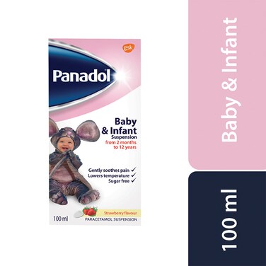 • <li>Short Description: <p><p>Gently soothes pain<p>Lowers temperature<p>Sugar free<p>Strawberry flavour<li>Large Description: <p>Panadol Baby and Infant Suspension is strawberry flavoured formulated to be pleasant tasting and comes with a dosing device so its easy to administer to infants and children and like all Children’s Panadol products it is gentle on little stomachs when used as directed.<li>Benefits: <p><p>It provides effective temporary relief from pain and fever associated with Toothache, Sore throat, Childhood infections, Immunisation and Teething<p>Relieves fever and pain after vaccination<li>Storage Temperature: <p>Room Temperature