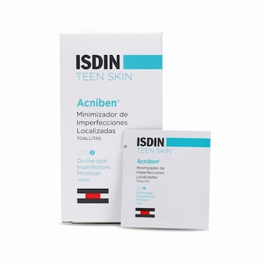 Isdin Teen Skin Acniben Minimizador Imperfection 30 Units (Toallitas) controls imperfections of oily or acne-prone skin anytime or anywhere. It offers hygiene and care for oily or acne-prone skin anytime, anywhere. Comedolytic and keratolytic thanks to the effect of salicylic acid. It diminishes the proliferation of microorganisms by its content in triclosan. Reduces redness and irritation due to its aloe vera content.