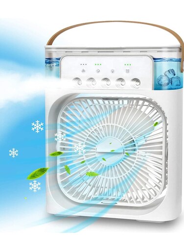 【2 in 1】Portable Air Conditioner Fan + Air Humidifier,It's not only a personal portable air cooler for cooling in summer, but also an air humidifier / aromatherapy machine in spring, autumn and winter. It would be useful all year round.Suitable for bedroom, kitchen, office, GYM, travel etc. 【Timing +7 Colors Lights】Three automatic timing (1/2/3H), you can choose the most suitable one to enjoy your leisure time,sleeping or working time;The Mini Air Conditioner Fan built in 7 soft lights.The light can be turned off completely while the unit is running;5 large-caliber sprays; 【Three Wind Speeds 】 3 wind speeds (Low-Medium-High) , and a 360° adjustment angle to customize your breeze to stay cool on hot summer days.Aromatherapy tablets can be added,Portable air conditioner is engineered to create powerful airflow using 6-inch oversized fan blades, covering a wider cooling range and keeping you in a comfortable environment 【Leak-Proof & Waterproof+ Low noise】Cover with sealing rubber ring,it will not leak water all over desk. Low noise operation,reducing working noise to as low as 38dB, and bringing comfortable airflow as soft as cool natural wind 【Leak-Proof & Waterproof+ Low noise】Cover with sealing rubber ring,it will not leak water all over desk. Low noise operation,reducing working noise to as low as 38dB, and bringing comfortable airflow as soft as cool natural wind