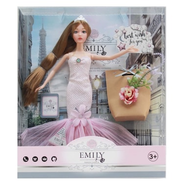 This doll is perfect for any fashion lover, as she is dressed in a fashionable outfit and has long, flowing hair. The pink bag adds an extra touch of style and can be used to carry around all of Emily's accessories.