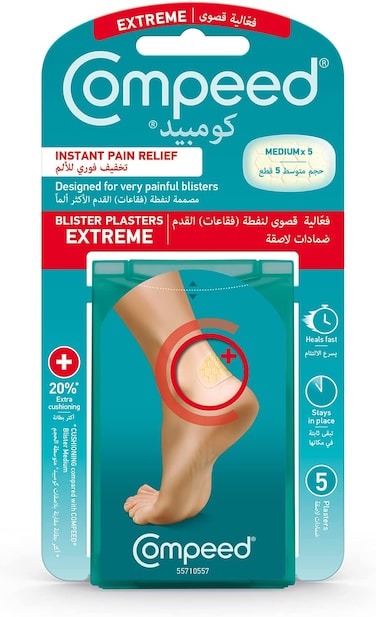 COMPEED Sports Heel Blister plaster with advanced hydrocolloid technology for instant pain relief and accelerated healing. The honeycomb design provides 20% extra cushioning* for optimal comfort and protection during any sport activity. It is a hydrocolloid gel plasters for treating blisters, corns, cracked heels, bunion, callous, sports heel & underfoot. Pack of 5. COMPEED hydrocolloid technology is an active gel with moisture absorbing particles. The COMPEED blister plaster acts like a second skin to support the natural moisture balance, to: Relieve blister pain immediately. Protect and cushion against rubbing. Offer fast wound healing. Stays in place for several days. Individual experience may vary. Directions to use: 1. Clean and dry skin before use, ensuring blister area is free of creams and oils. 2. Remove the top paper, then the bottom paper, avoiding touching the adhesive side. 3. Apply plaster firmly over blister, ensuring the edges are well smoothed down. 4. Leave in place until it starts to detach (Note: may stay in place up to several days). 5. To remove plaster: do not pull upwards but slowly stretch along the skin.