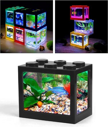 - <p> (Best Small Fish Tank Set): The 3/5 gallon office desktop square small fish tank made of acrylic glass can raise betta, guppies, angelfish, other ornamental fishes, turtle, reptile, jellyfish, shrimp, moss, crab, and insects. Add a mini light to the top of the tank, so the cube can be used as a decoration in your room<p>(Easy to Use): One hand to hold the transparent inner tank, the other hand to hold the outer frame, pull in the opposite direction can open the fish tank. It has a feeding hole at the top, which can feed the fish without opening the lid of the fish tank. The surface of the fish tank is smooth and easy to clean.<p> [Creative] It is not only a betta fish tank, but also can be used as a feeding box for small reptiles, a feeding box for small ornamental plants, a feeding pool for seaweed and small corals. As long as you pay attention to changing water, this small breeding box can meet your many needs.<p> [Decoration] There are two surfaces of the aquarium are transparent and the view inside the aquarium is clearly visible, which is very interesting. The creative building block design can be used to shape multiple fish tanks into different shapes to decorate your desktop.<p> (Power Supply): Energy-efficient USB power LED lighting with dazzling color selections (white, blue, green, amber, aqua, purple, or red) to brightly illuminate your fish. Aquarium lights can be turned on or off for the easy nighttime operation.<p>The USB cable comes out from the side and the fish tank is seamlessly connected vertically. You can Freely Combine Superimpose,very fun, The Night View of the Fish Tank is very