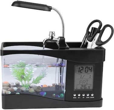 VSELL24 MINI FISH TANK- 2 switches are used for turning on/off the LED light and switching the water pump on/off. Lighting LCD display is featured with alarm clock, calendar, time, date, temperature, and snooze. compartment desk organizer or pen holder for setting pens, rulers, etc.