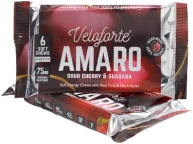 Veloforte Amaro Energy Chews - Sour Cherry & Guarana - 9 count x 6 Chews - 42gr Carbs, 75mg Caffeine, Pure Electrolytes, All Natural,Vegan,Gluten Free