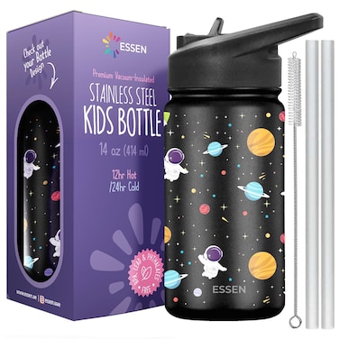 • PREMIUM 18/8 STAINLESS STEEL: Are you worried about choosing one safe water bottle for your child? ESSEN 414ml Kids’ water bottles are made of high-quality 18/8 stainless steel, BPA-free, 100% non-toxic, and odorless. The wide-mouth design makes cleaning a breeze, which is always a win for busy parents! • VACUUM-INSULATED WATER BOTTLE: Whether you're sending your child off to school or on a family outing, this double-walled vacuum insulation technology will keep drinks cold for 24 hours or hot for 12 hours. So your child can enjoy their favorite beverage at the perfect temperature, no matter where they are! • 100% LEAK-PROOF STRAW LID: Our straw lid is leak-proof when in the closed position. The sturdy handle, sweat-free design, and leak-proof straw lid make it easy for kids to take the water bottle and confidently carry it in their bag without worrying about messy accidents! Hand wash only with soapy water. • THE PERFECT FIT: Our stainless steel water bottles are designed with an opening wide enough for most ice cubes to be refilled and reused repeatedly. Engineered for little hands, our reusable water bottles combine durability with ease of use while delivering superior functionality. • HYDRATION-MADE FUN FOR KIDS: With vibrant, scratch-resistant prints, children will be eager to sip and stay hydrated throughout the day, thus making them perfect for keeping them refreshed and energized. They fit just right in most standard-size cup holders and are a great match for trips, school, sports, camping, outings, car rides, and adventures.