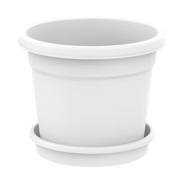 Made from durable plastic, this flower pot features a round shape and a white colour that complements any decor. It also comes with a matching tray to catch excess water and keep your plants healthy.