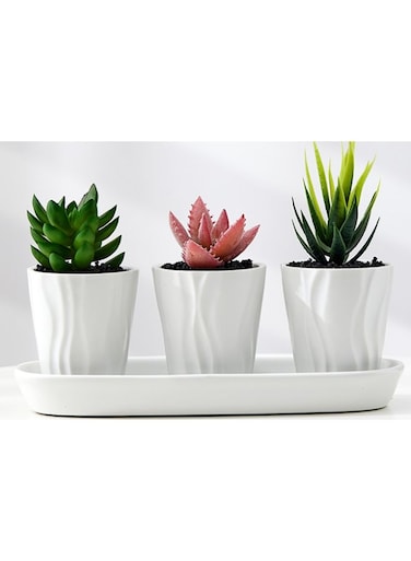 Generic 3 Pcs Geometric Succulent Designed Planter With Trey, Set Of 3 White Ceramic Succulent Cactus Square Planter Pots With Bamboo Tray(Plants Not Included)