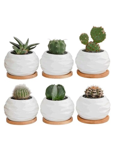 Generic 6 Pcs Geometric Succulent Planter, Set Of 6 White Ceramic Succulent Cactus Wave Design Planter Pots With Bamboo Tray(Plants Not Included)
