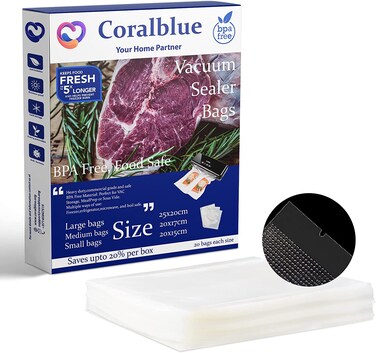 Coralblue brings your ideal kitchen partner, vacuum sealer bags to store food that stays fresh yet full of nutrients. Easy to Vacuum and seal: · The Embossed Micro Channel design make it efficient for vacuuming and sealing, the material is water and air proof preventing from leakage and freezer burn. · The included Bone Guard can be used to prevent food from puncturing the vacuum bag. Vacuum sealing bags are ideal for sous vide cooking T-bone calves, denim bones, ribs, seafood and for preservation of fruits and vegetables. IDEAL MEAT STORAGE Prevent FREEZER BURN and DEHYDRATION. Sous Vide. Perfect for Storage, Meal Prep and Sous Vide. FRESHNESS INTACT Keeps Freshness Flavor and nutrients intact LONGER SHELF LIFE Extend shelf up to 3-6 times longer Food saver bags Perfect for busy homes, compatible with all sealer machines. Supremely air tight packaging delivers top-notch flavors, easily customizable sizes to ensure best user experience. Preserve your food for longer durations to minimize wastage.