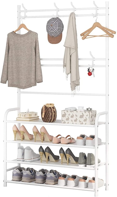 Coat Rack Shoe Rack,Storage Shelf with 4-Tier Shoe Organize ,Clothes Rack with 8 Hooks Hanging, Entryway Hall Trees Hanging and Storage (White)