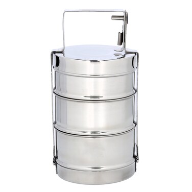 This uniquely shaped Tiffin comprises 3 equal sized layers. Multiple size containers are used to carry food of various quantities. All 3 layers and lids are held firmly together by the separate clamping mechanism and it's perfect for all carrying lunch while traveling as this stainless-steel product will keep your food hot for long. It has exotic silver shining and it's Easy to clean. This is the ideal Tiffin for everyone. Made from 100% Stainless making them highly durable and resistant to corrosion.