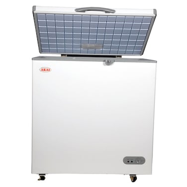 - Make the most of your space with the AKAI CFMA-150CE Chest Freezer. The chest freezer features a huge 150 litres of storage space and is perfect for large families. More space means more food storage, letting you make the most of your time by cutting down on shopping trips. The counterbalanced lid provides easy opening and closing, making a perfect everyday freezer solution for people who want that extra bit of storage. For a chest freezer with excellent space and features designed to make your everyday life as simple as possible, the AKAI Chest Freezer is an excellent choice. Adjustable Thermostat, Drain Plug, Lock, Aluminium Lining Inside, one Basket