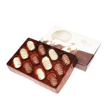 - Delicious treat of authentic and juicy dates stuffed with premium almond nuts and enrobed with milk and white chocolate