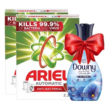 Ariel Antibacterial Detergent Powder For Automatic Washing Machine 2.25kg Pack of 2 And Downy All In One Fabric Softener Valley Dew 880ml