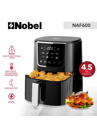 - <p><li>Nobel Air Fryer NAF600 - Healthier Cooking Made Easy!<p><li>Generous 4.5L Capacity: Prepare large meals for the family or gatherings with ease.<p><li>Versatile & Safe: 8 Preset Programs, Delay Function, and Overheat Prevention for convenience and safety.<p><li>Customizable Cooking: 1-60 Min Timer, 80-200°C Temperature range for precise control.<p><li>Efficient & Healthy: 1400W High-Speed Air Circulation Technology for rapid, oil-efficient frying. Non-Stick surface for easy cleaning after use.