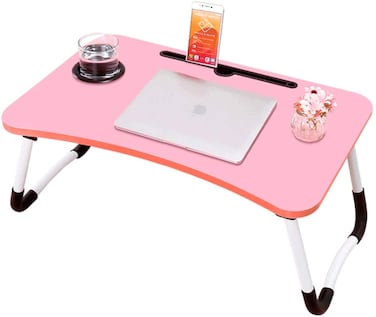 Foldable Laptop Bed Table Multi-Function Lap Bed Tray Table with Storage Drawer and Water Bottle Holder, Serving Tray Dining Table with Slot for Eating, Working on Bed/Couch/Sofa - Pink, LT3-PNK