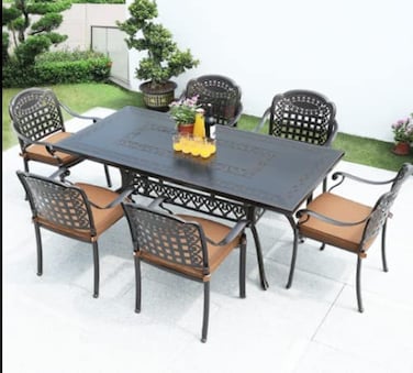 7-PIECE SET: This high-class set includes 6 chairs and a table in a beautiful, adding style to your space without sacrificing comfort. The chairs fit perfectly around the table for backyard family dining, picnics, or lounging poolside with friendsRUST-RESISTANT METAL: The Great Deal Furniture table and chairs are made of sturdy and durable cast aluminum that is rust-resistant, for years of outside use. The all-weather quality helps prevent water damage caused by wet swimsuits and splashing, making it a great set for the pool This dining set is the perfect addition to any space outside, like a backyard patio, outdoor deck, in a sunroom or garden, or near a pool, outdoor bar, grill, or BBQ pit.