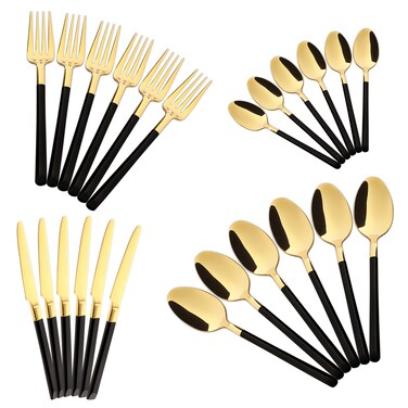 Life Smile 24 Pieces Cutlery Set Service for 6 person,Pure Stainless Steel Flatware Set,Mirror Polished Cutlery Utensil Set Include Spoon/Fork/Knife/Tea Spoon(SHINY GOLD HEAD & SHINY BLACK HANDLE)