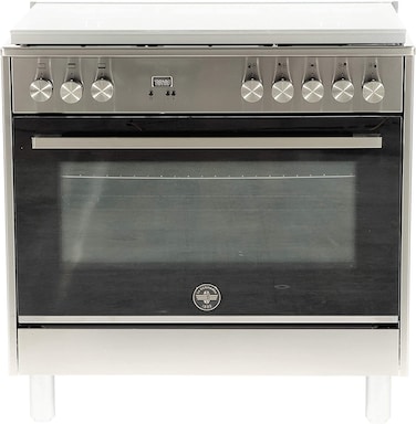 90x60 CM Full Gas Cooker, 5 Burners. Heavy Cast Iron Pan Support, One Hand Ignition. Gas Oven, Fan in Oven, Self Cleaning, Stainless Steel. Made in Italy. This single-oven cooker has a stamped stainless-steel worktop with 5 burners, including a central high-performance burner with precise control from low simmer to high output. The gas oven is fan assisted and has 5 functions. The cooker features digital timer with pushbuttons on stainless-steel fascia. The oven door is double-glass with a wide extractable inner glass.