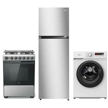 Midea 6 Burner Gas Cooker CME6060D With Double Door Fridge 266L MDRT385 And Washer MFN70 7kg Silver