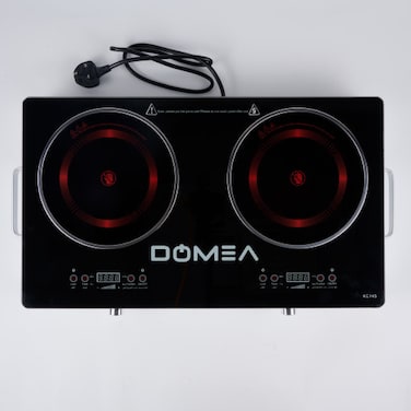 - A-GRADE MICRO CRYSATL PANEL : The DOMEA infrared cooktop comes with double burner with power of 1800Watt for each. The A-Grade micro-crystal panel heats up quickly and stays hot for few more minutes after turn off. You can cook dishes quickly. This electric ceramic hob has 4 power levels to meet your different choice which is convenient for you to choose the right power to cook a variety of different foods. EASY TOUCH OPERATION : The DOMEA infrared cooker features easy touch controls with LED display. You can adjust the temperature and timer time you want with just a touch. There are 4 preset function keys on the control panel for the selection of cooking modes. DOUBLE HOB WITH 1800W+1800W : The double hob infrared cooker make your cooking easier.Which saves your time in the kitchen and greatly reduces energy consumption.The 2 burners can be cooked with same power,1800W+1800W , at same time. The dual power zones greatly reduces the heating time. CHILD SAFETY LOCK : The DOMEA infrared cooktop features a child safety lock. The child lock is designed to prevent anyone especially children, accidentaly activating hob.