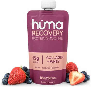 Huma Recovery Whey Protein Smoothie- Mixed Berries- 12 count x 142g- 15gr Protein, Collagen & Whey, Real Fruits, Healthy Fats, Electrolytes, All Natural, Gluten Free, For Joints, Muscles, Heart, Bones
