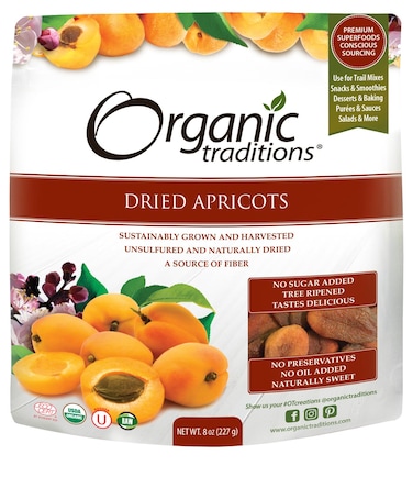 - Apricots have been eaten by traditional cultures around the world for centuries. It is said that the earliest cultivation of apricots dates back to 3000 B.C. Organic Traditions offers the finest Certified Organic, Kosher and unsulfured apricots. They are vine ripened to ensure the highest concentration of both nutritional vibrancy and flavor and then naturally dried to a soft, deliciously chewy texture. As a source of Fiber they can be easily incorporated into ones daily nutritional program for optimal health benefits. Whole dried apricots with a delicious taste Naturally dried Great source of fiber