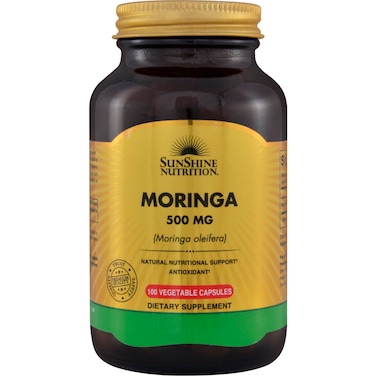 - Sunshine Nutrition’s Moringa is packed with 100% Natural Moringa leaf powder. Moringa (Moringa oleifera) leaves have been used as part of traditional medicine for centuries and are packed with an incredible amount of nutrients – Protein, B-Vitamins (B2 and B6), Vitamin C, Minerals (Rich source of Calcium, Magnesium, Zinc, Iron) and several other healthy antioxidants like beta-carotene; thereby offering an excellent nutritional support. • Natural Nutritional Support • Antioxidant SUGGESTED USE: As a dietary supplement for adults, take one (1) softgel daily, preferably at mealtime, or as directed by the healthcare practitioner.