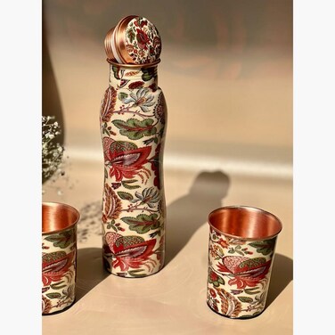 This exquisite copper bottle with two glasses is not only a stylish accessory but also a practical and healthy choice for storing and carrying drinking water. Its numerous benefits make it a must-have item for anyone who values their health and well-being. Thanks to its antibacterial properties, the copper bottle helps to keep the water safe and free from harmful bacteria. Additionally, it aids in digestion, reduces inflammation, and is believed to balance the three doshas according to Ayurvedic medicine. The copper bottle is also a natural booster for the immune system, promotes healthy skin, and provides an overall sense of wellness. Regular cleaning with a mixture of lemon juice and water is recommended to maintain the bottle's shine and prevent tarnishing.